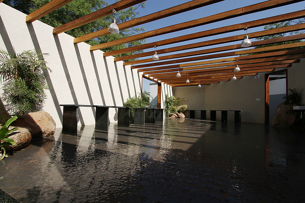 A grove of exotic palms divide the wedding and dining space of the area. The civil footprint is kept to a bare minimum by creating semi open structures with the use of landscaped courtyards.