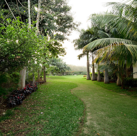 An avenue-style approach road leads through a grove of trees to the entrance porch, which opens out to expansive, undulating lawns.. The landscape and built form together create a calm, immersive environment rooted in simplicity and elegance.