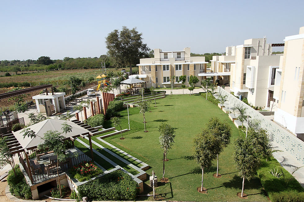A green common plot with free standing orange concrete columns in front greets one on entering the Green ville housing scheme in Anand.