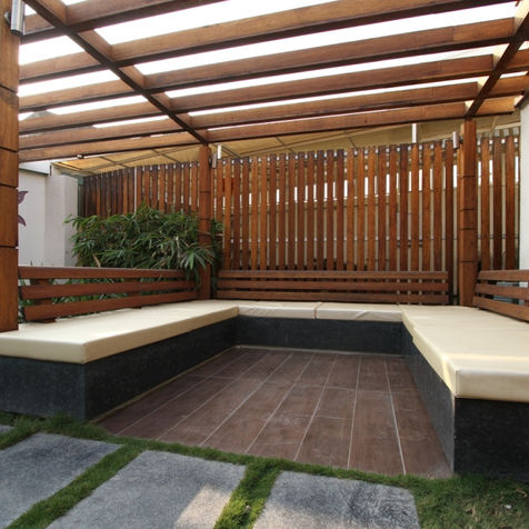 This site is a typical duplex plot of 2800 sq. ft. with Mr. Vijay’s residence on the side. The challenge was to create a farm house environment with all amenities right next to his existing house in the very urban heart of Baroda city with POL houses around. A luxurious farm with all modern amenities like openness with green lawns, a pool with deck, Gazebo or pergola sittings, water features & sculptures, trees & shrubs etc were what the client desired.