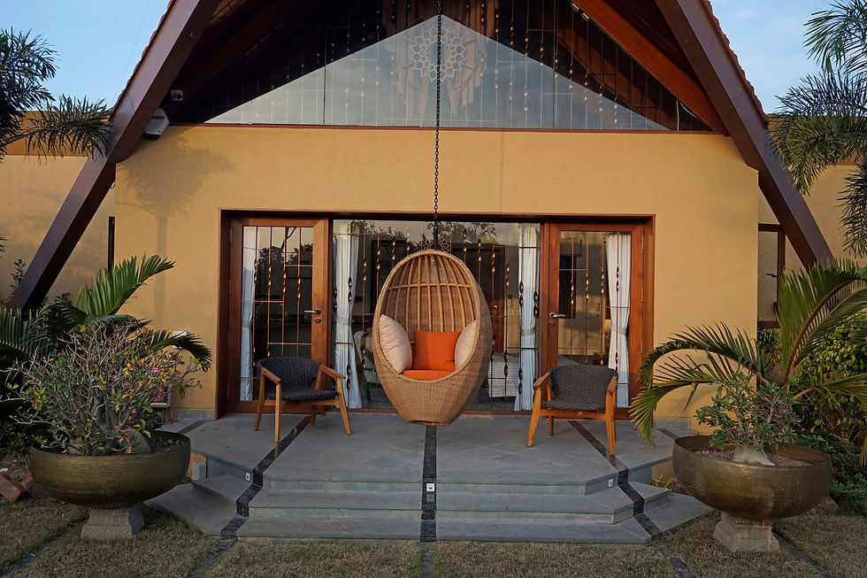 The design draws from vernacular elements like the King Post sloping roof with chill wood decking and Mangalore tiles, reinterpreted in a refined material palette. Polished Kota stone flooring, exposed wooden ceilings, and painted surfaces with curated artwork create a warm, tactile environment. Most furniture was custom-designed on site, with a few select pieces by NID designers.